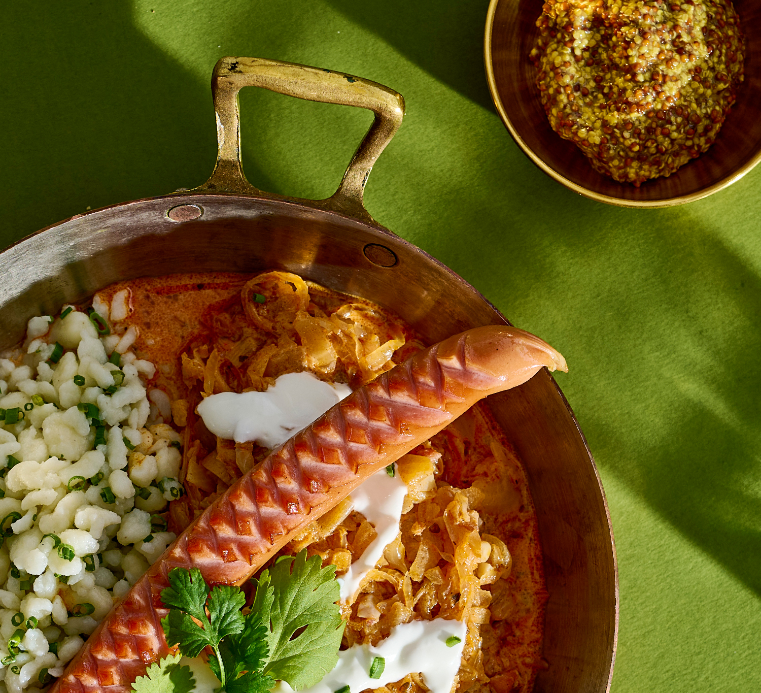 Sült virsli vajas-snidlinges tarhonyával korhely raguval