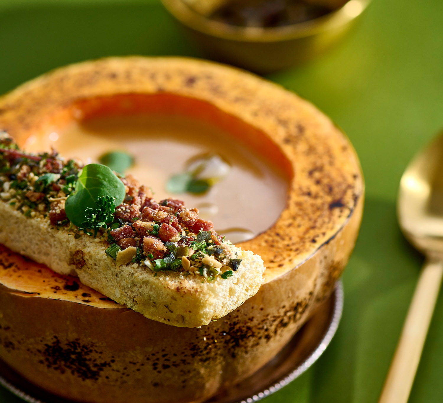 Gyömbéres sütőtökkrémleves bacon morzsás pirított tökmag granolával
